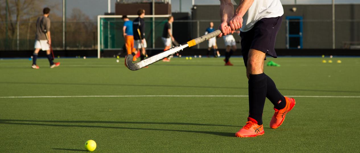 Then, to strike, the arms and stick swing (circle) towards the ball. On impact, the ball is at the level of the left foot, the hands at ball height, and the stick is at 45 degrees to the field.