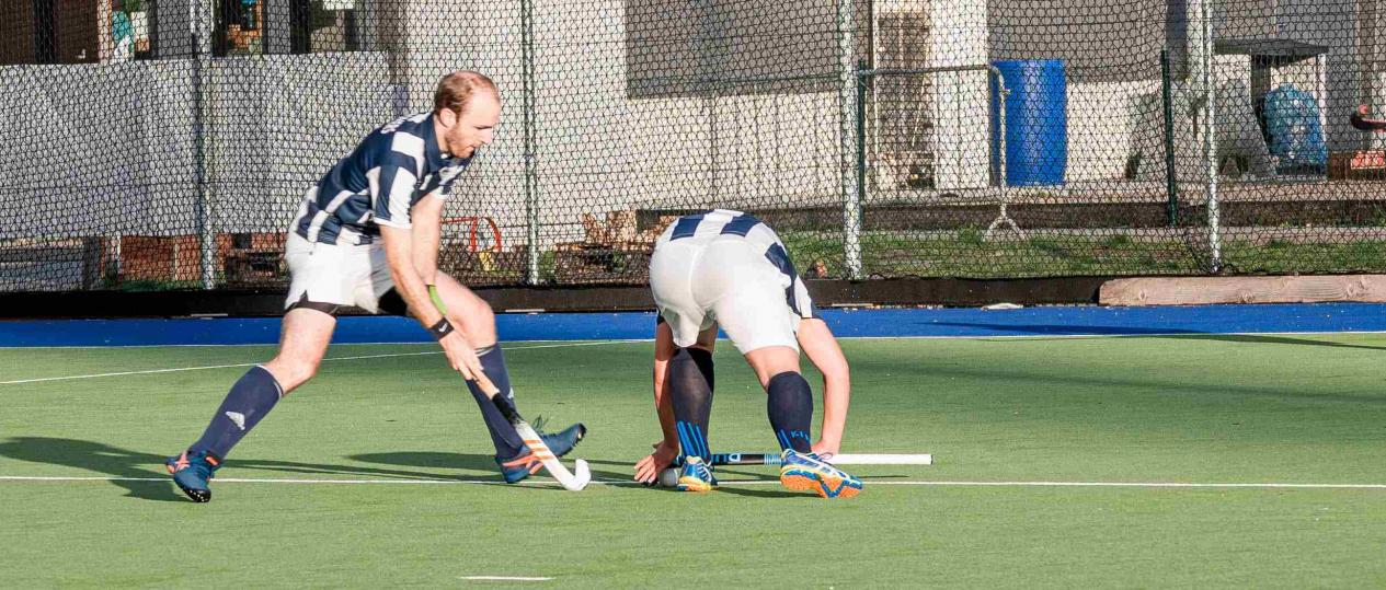 The legs are bent with the shoulders towards the ground. The stick touches the ground completely, the hands being a few centimetres from the ground. The ball is located at the level of the right foot; the centre of the flat side of the stick is in contact with the ball.